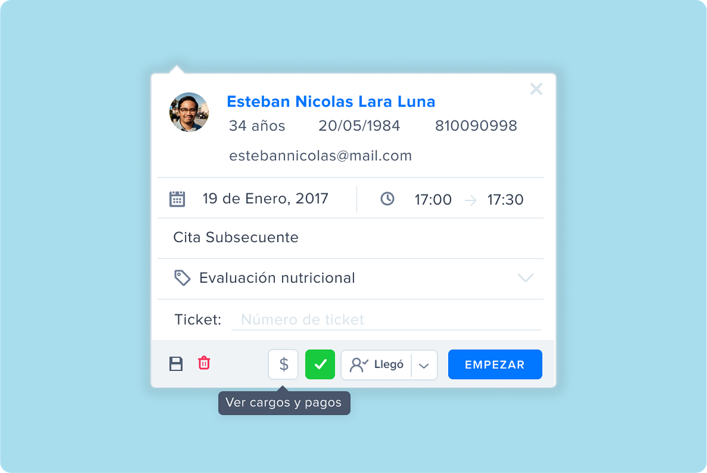 Para ahorrar clics en el flujo de recepción, añadimos un enlace directo desde la cita en la agenda hacia la pantalla de cargos de ese encuentro. Así, desde la agenda, el equipo administrativo puede saltar directamente a la gestión del cobro del paciente con un solo clic.