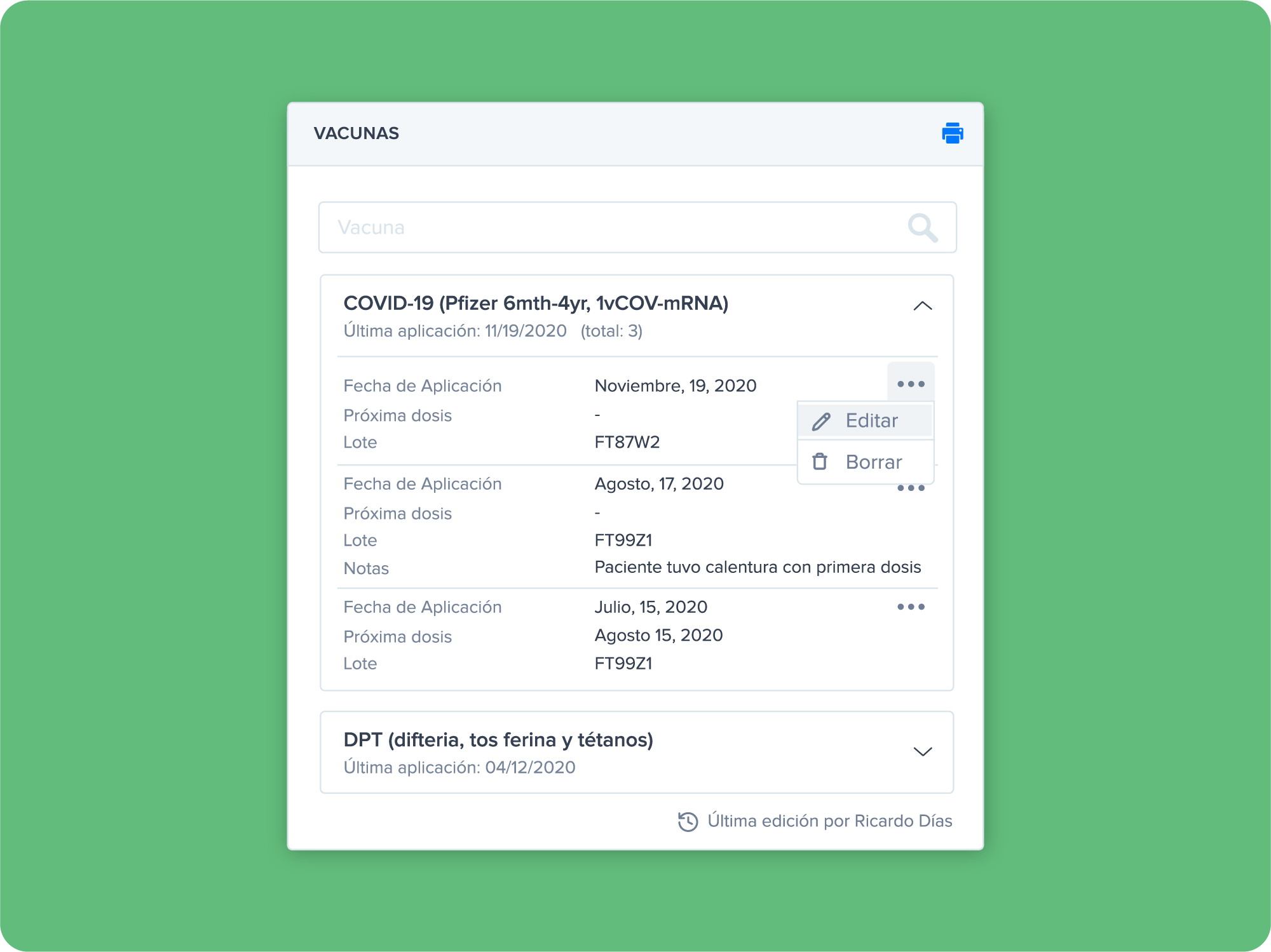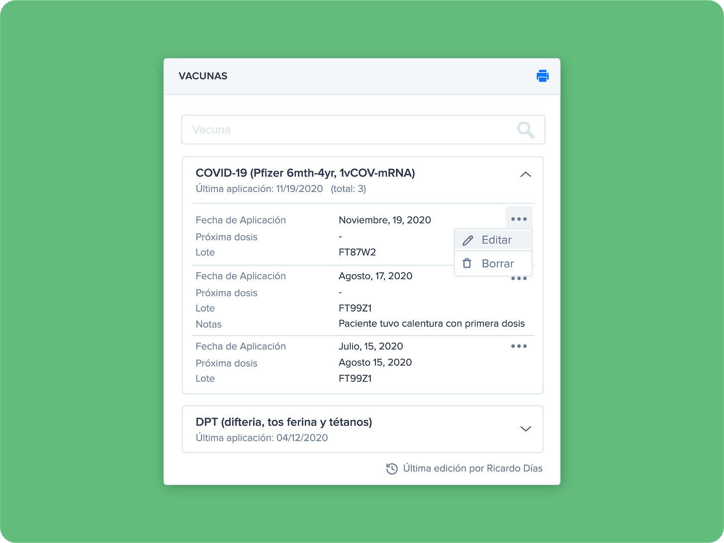 Por último, actualizamos por completo el módulo de vacunación. No es solo un cambio visual; ahora es mucho más rápido y la búsqueda de biológicos es instantánea. También eliminamos la necesidad de expandir pestañas para ver los detalles: toda la información relevante (lote, fecha, dosis) ahora es visible de forma clara en tarjetas.